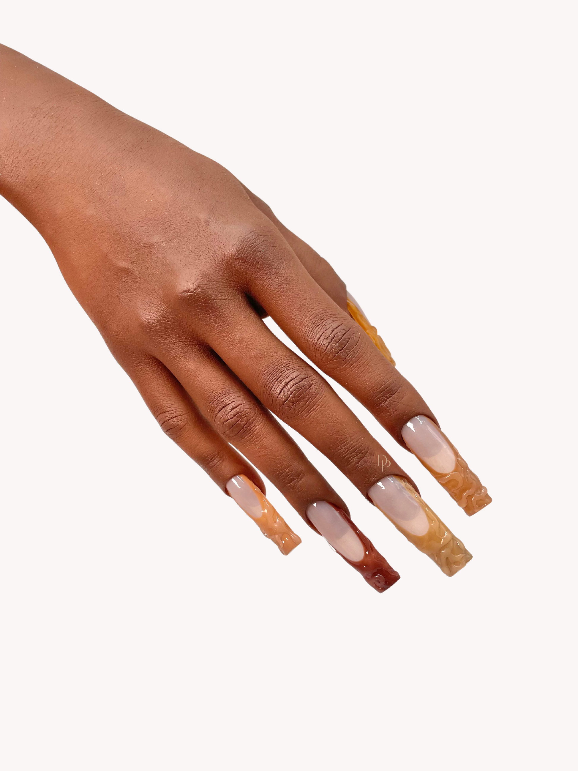 This Brown Sugar nail set brings luxury to your fingertips with its 3D nail art in a classic French tip style. The perfect balance between chic and bold, each set offers a unique blend of sophistication and modernity for an effortless look of elegance.