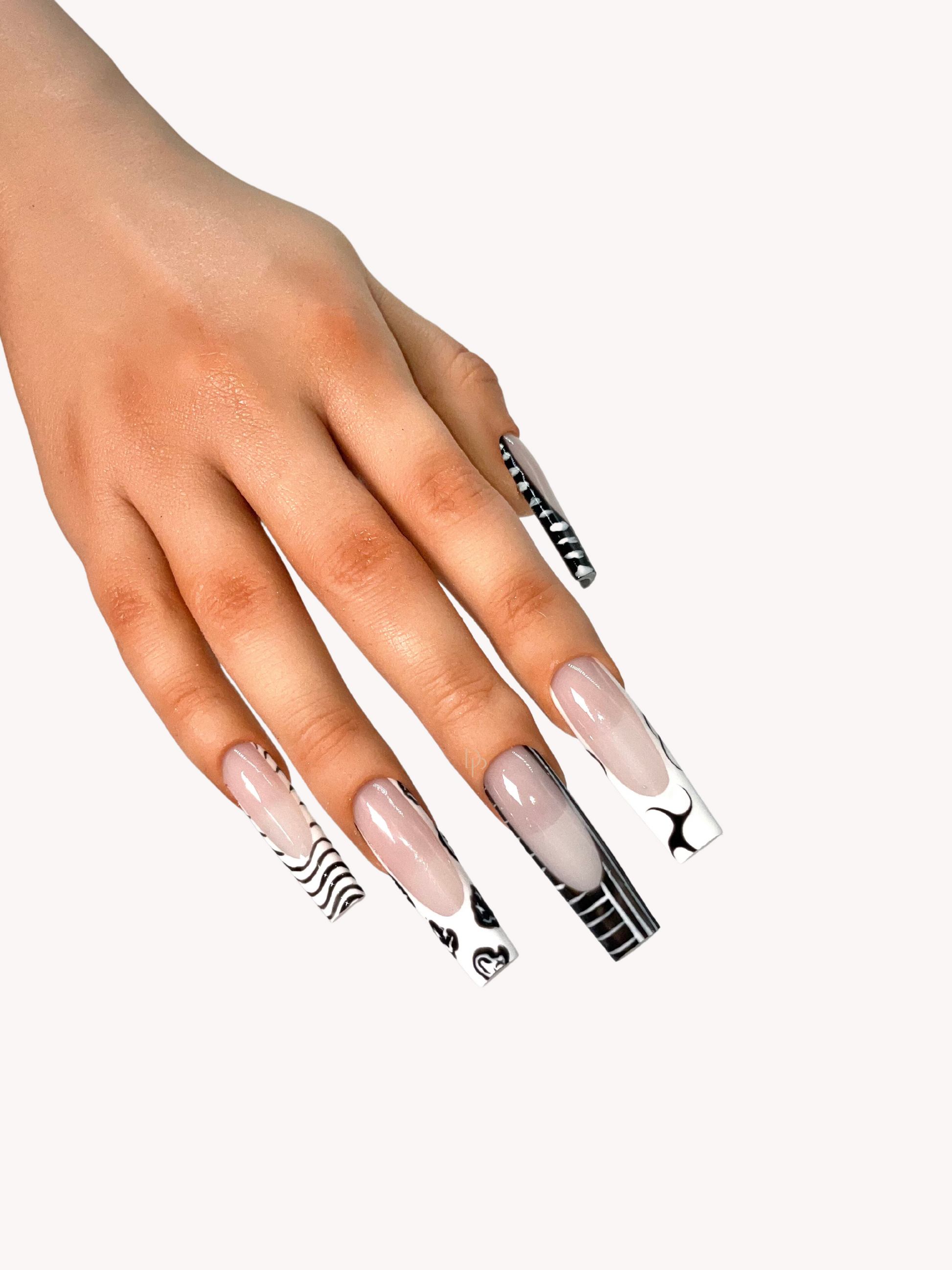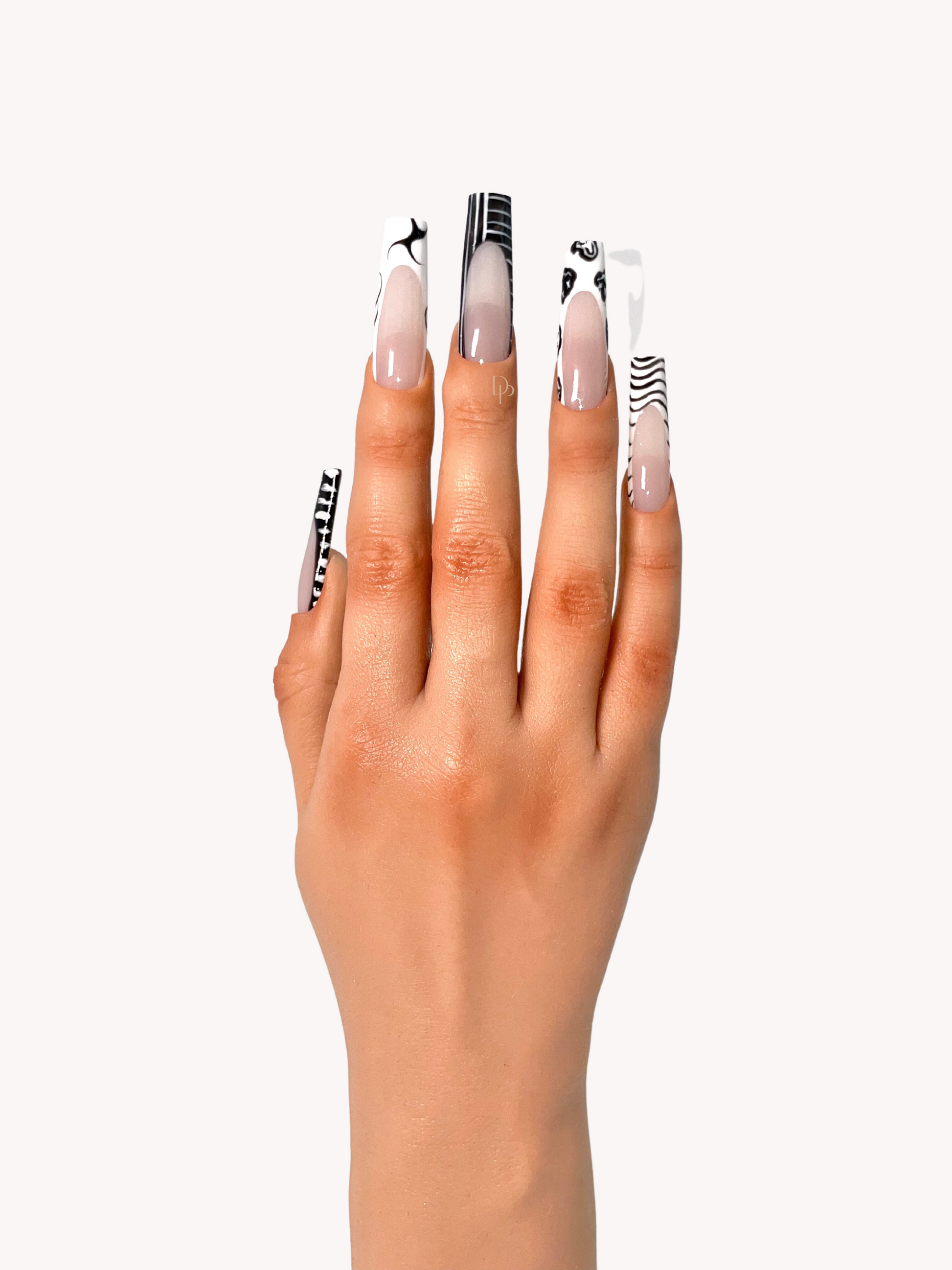 Wednesday is here to meet all your manicure needs! Featuring a classic French tip design with a modern freestyle design in sleek black and white, you'll have your Monday to Sunday covered in style!