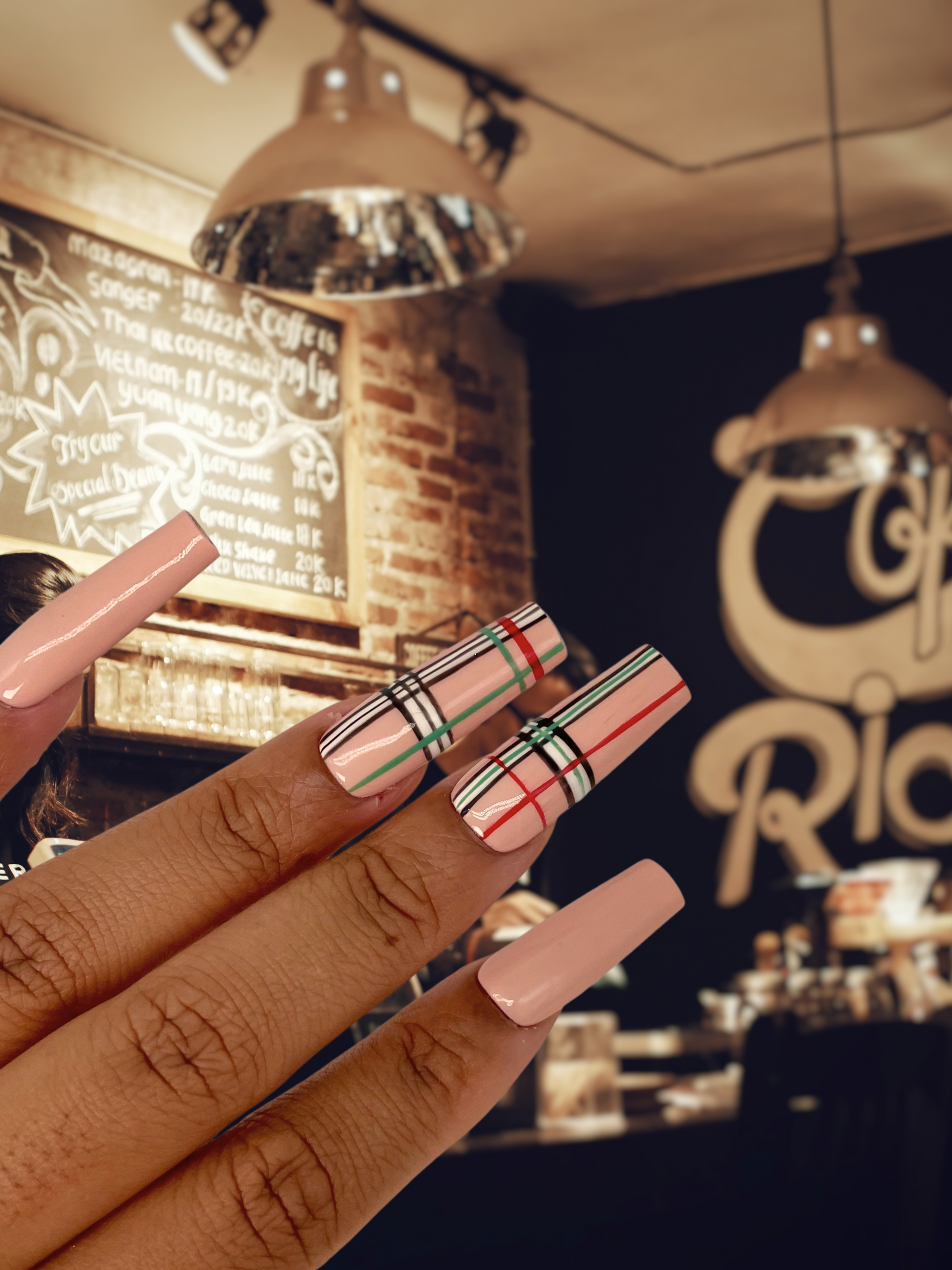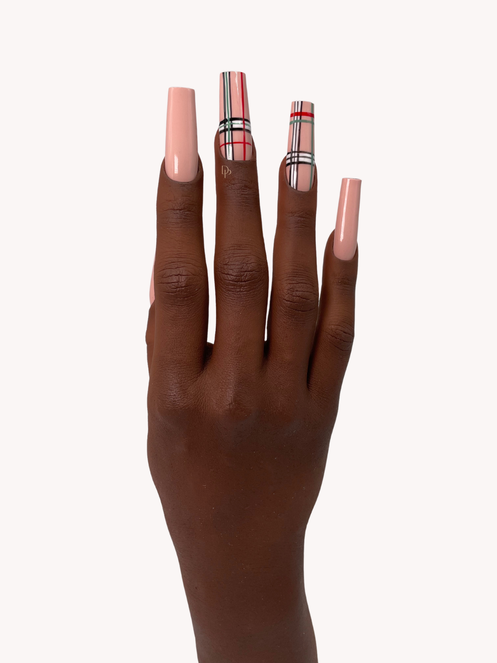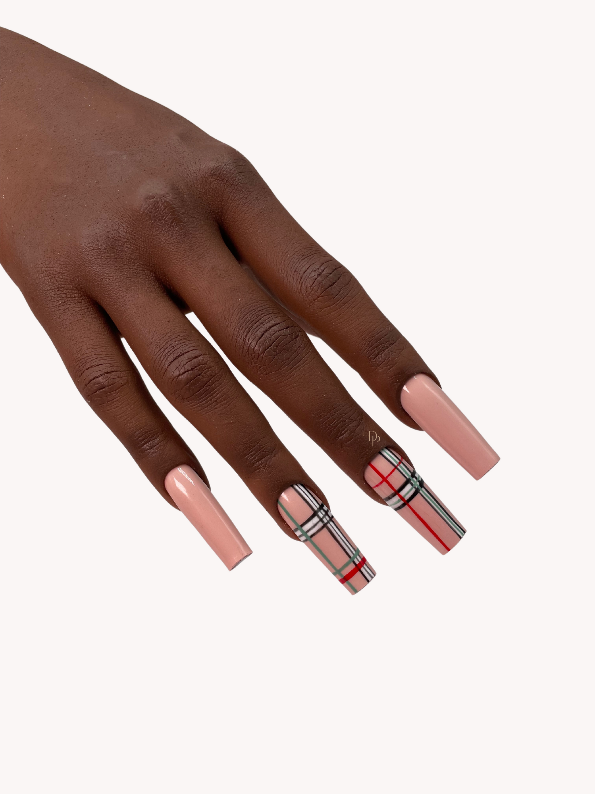 Lux offers the perfect balance of sophistication and subtlety. Its nude feel is complemented by the luxury of a hand drawn plaid design. Red glitter accents add a touch of unexpected glamour.