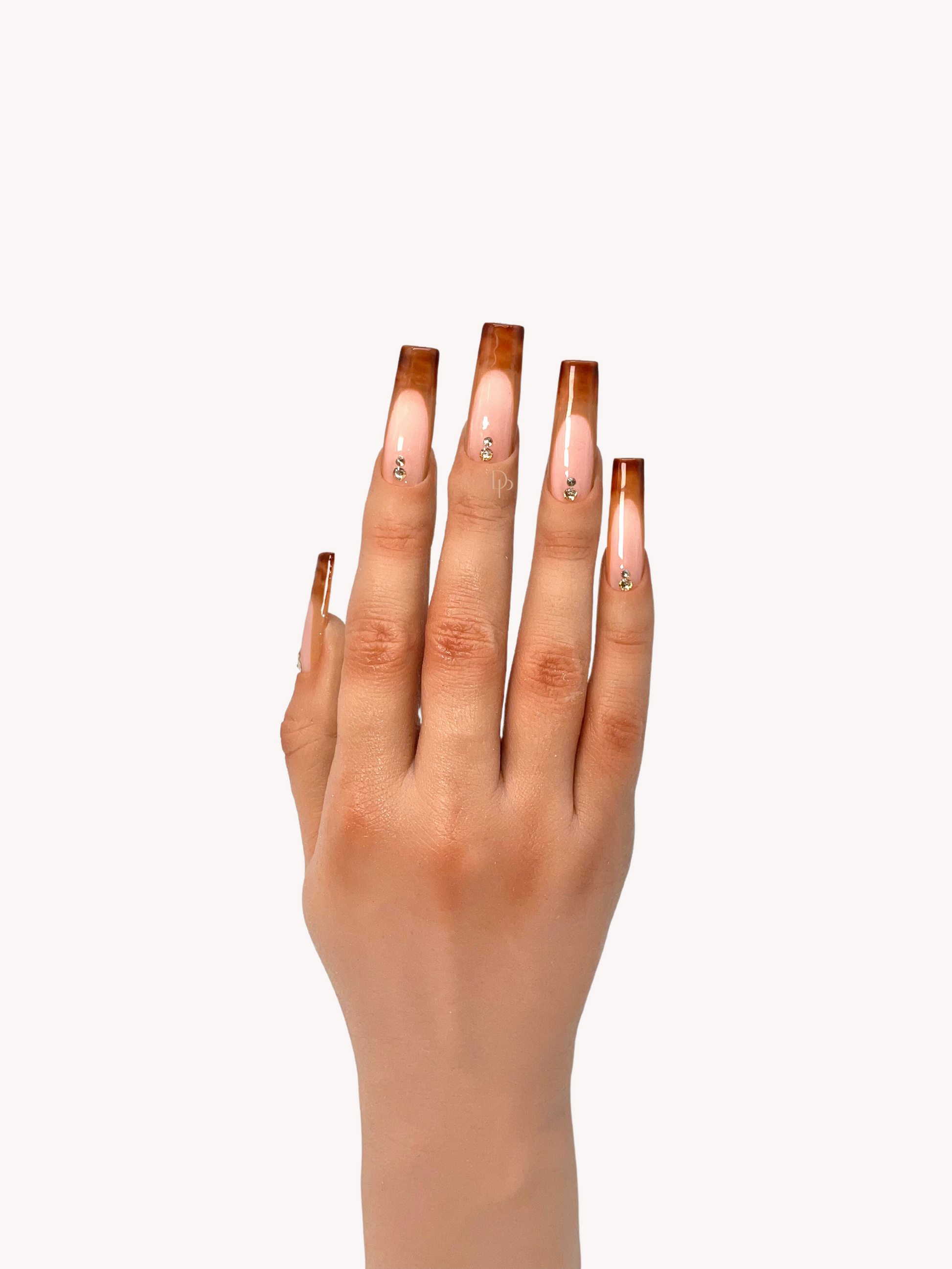 Our Mocha design features an elegant French tip with an ombre brown gradient. Minimal bling adds a hint of sparkle for an exclusive, sophisticated look.